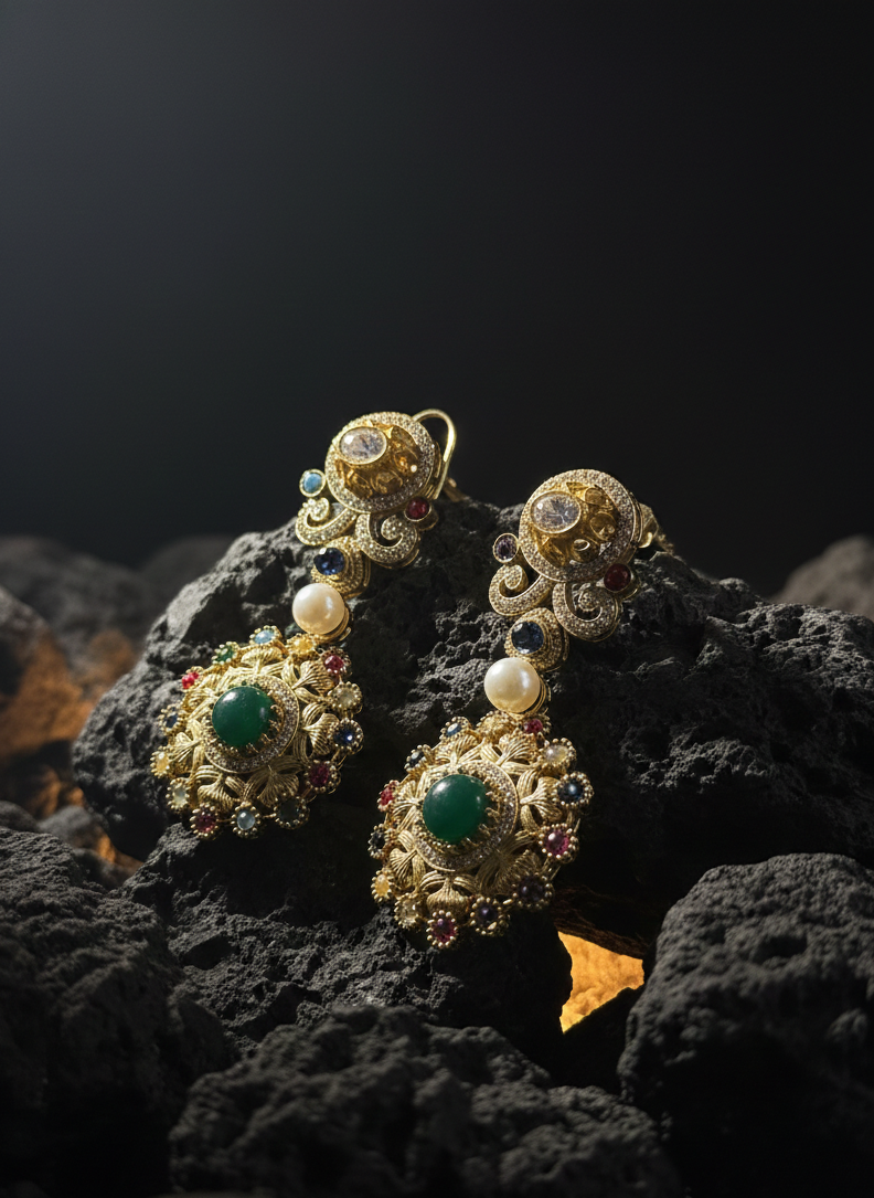 β’ Gemstones: Simulated Emerald cabochons, Ruby-red accents, Turquoise-blue beads, and Lustrous Seed Pearls.