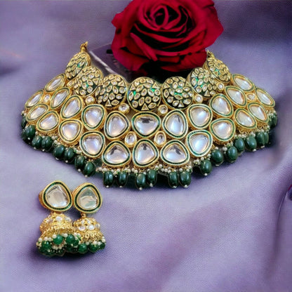 Introducing the Siya Sundari Designer Kundan Wedding Necklace Set, a regal masterpiece that will transform you into a queen on your big day. This opulent jewelry set is designed to captivate and radiate timeless elegance.